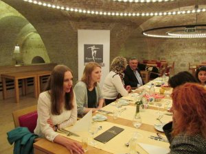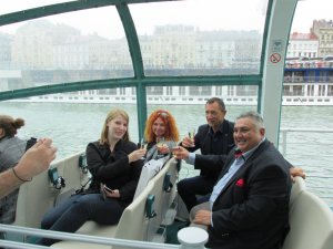 Nem is indult jól a reggel, zuhogó esőben araszoltunk be Ferihegyről, és a hajós városnézés sem volt az igazi annak ellenére, hogy az újságíró hölgyek nagy lelkesedéssel fotózták a párás Budapestet. A dolgok akkor fordultak jobbra, amikor megérkeztünk a Gellért szállóba egy gyors szakmai ebédre. Úgy gondoltuk, hogy nem luxus ételekkel, hanem egyszerű magyaros étkekkel kínáljuk őket: lecsókrémmel és tepertőkrémmel, pogácsával, igazi házi kenyérrel. Vendégeink nagy örömmel fogadták ezt a menüt, főleg, hogy ekkor már Román Sándor koreográfus, Beke Farkas Nándor, a 100 Tagú Cigányzenekar vezetője és Meskó Zsolt, a Fergeteges rendezője is az asztalnál ült.