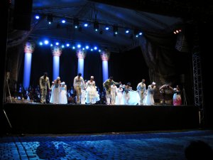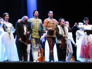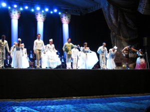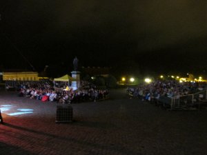 Ezek után nagy lelkesedéssel indultunk Esztergomba, hogy megnézzük a Fergetegest az impozáns Bazilika előtti téren. Igen ám, de az egész nap zuhogó eső miatt az a veszély fenyegetett, hogy elmarad az előadás. Vona Tibor ügyvezető padlógázzal érkezett a helyszínre, hogy a városvezetéssel együttműködve kitalálja a megoldást. Együtt aztán valahogy elállították az esőt :), amely kezdés előtt fél órával teljesen megszűnt. Pokrócokat, esőkabátokat osztottunk és a rajongók érkeztek is rendíthetetlenül, teljesen megtelt a nézőtér. Az első felvonás végére már nem éreztük a hideget, a második végére már a valóságot sem, hiszen mindannyian Sissi báltermében táncoltunk lélekben.